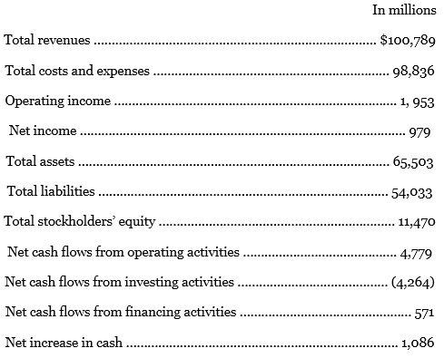 In millions Total revenues $100,789 Total costs and expenses 98,836 Operating income 1, 953 Net income .. 979 Total assets 65,503 Total liabilities . 54,033 ....... Total stockholders' equity 11,470 Net cash flows from operating activities 4,779 Net cash flows from investing activities (4,264) Net cash flows from financing activities 571 ...... Net increase in cash 1,086