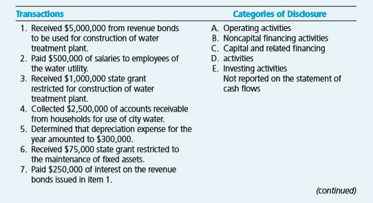 Categorles of Disdosure A. Operating activities B. Noncapital financing activities C. Capital and related financing D. activities E. Investing activities Not reported on the statement of cash flows Transactions 1. Received $5,000,000 from revenue bonds to be used for construction of water treatment plant. 2. Paid $500,000 of salaries to employees of the water utility. 3. Received $1,000,000 state grant restricted for construction of water treatment plant. 4. Collected $2,500,000 of accounts receivable from households for use of city water. 5. Determined that depreciation expense for the year amounted to $300,000. 6. Received $75,000 state grant restricted to the maintenance of fixed assets. 7. Paid $250,000 of interest on the revenue bonds issued in item 1. (continued) 8. Borrowed $125,000 from a local bank on revenue anticipation notes payable. 9. Paid $5,000 of interest on the notes payable in item 8. 10. Spent $1,200,000 of the revenue bonds for construction of the water treatment plant. 11. Paid $5,000 fire insurance premium on June 30, 20X9, for next year's insurance coverage. 12. Determined that uncollected accounts receivable amounted to $135,000 on June 31, 20X9. 13. Acquired $250,000 of state bonds as an investment of idle funds. 14. Received $7,500 of interest on the state bonds in item 13. 15. Received a $375,000 contribution from the city's general fund to be used for the construction of water treatment plant.