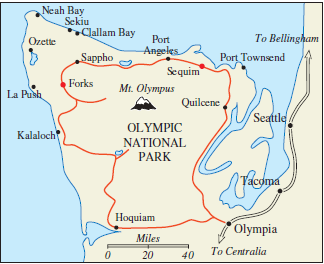 The Olympic Peninsula Following is a map of the Olympic Peninsula in the state of Washington. Using the scale on the map, estimate the distance of the route shown in red, starting at Forks and ending at Sequim, passing through Port Angeles.