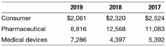 The operating profits from 2017 to 2019 reported by each of Johnson & Johnson's primary business segments are provided below. Sales numbers for each of the segments are provided in ID5.14 ( dollars in millions).