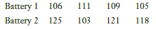 The operations manager of a manufacturer of television remote controls wants to determine which batteries last the longest in his product. He took a random sample of his remote controls and tested two brands of batteries. Here are the number of minutes of continuous use before the batteries failed for each brand. Is there statistical evidence of a difference in longevity between the two batteries?