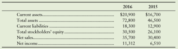 2016 2015 Current assets.. $20,900 72,800 $16,700 46,500 12,900 26,100 30,400 6,510 Total assets Current liabilities 18,300 30,500 35,700 11,312 Total stockholders' equity. Net sales. . Net income. .