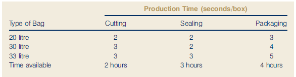 The Our-Bags-Don’t-Break (OBDB) plastic bag company manufactures three plastic refuse bags for home use: a 20 litre garbage bag, a 30 litre garbage bag and a 33 litre leaf-andgrass bag. Using purchased plastic material, three operations are required to produce each end product: cutting, sealing and packaging. The production time required to process each type of bag in every operation and the maximum production time available for each operation are shown (note that the production time figures in this table are per box of each type of bag).