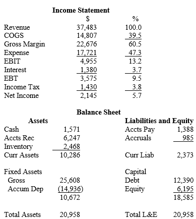 Income Statement % 100.0 39.5 60.5 Revenue 37,483 14,807 22,676 17,721 4,955 1,380 3,575 1,430 2,145 COGS Gross Margin Expense ЕBIT 47.3 13.2 Interest 3.7 EBT 9.5 Income Tax 3.8 Net Income 5.7 Balance Sheet Liabilities and Equity Accts Pay Аcсuals Assets Cash 1,571 6,247 2,468 10,286 1,388 Accts Rec 985 Inventory Curr Assets Curr Liab 2,373 Fixed Assets Сapital Debt Gross 25,608 (14,936) 10,672 12,390 6,195 18,585 Accum Dep Equity Total Assets 20,958 Total L&E 20,958