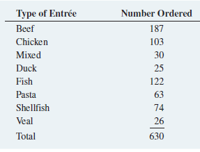 Type of Entrée Number Ordered 187 103 Beef Chicken Міxed 30 Duck 25 Fish 122 Pasta 63 Shellfish 74 Veal 26 Total 630