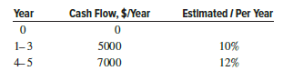 > For the cash flows shown, determine the equivalent uniform annual worth in years 1 through 5 at an interest rate of 18% per year, compounded monthly.