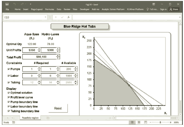 Fig4- Fide Home ert Page layeut Feirmulas Data Revi Vieu Develoger Addins Analytic Sclver Platfom XLMiner Platform Tell me Sign in Share 110 Blue Ridge Hot Tubs Aqua-Spas Hydro-Luxes (X,) (X) 250 Optimal aty 122.00 78.00 225 Unit Profits 5350 : $300 200 Total Profit S66,100 175 Constraints Required Available 150 Pumps 200 125 PLabor 1566 100 Tubing 16 2880 75 Display Optimal solution 50- P Profit level curve 25 Pump boundary line P Labor boundary line * Tubing boundary line Reset 25 50 75 100 125 150 175 200 225 X, Femible region Ra
