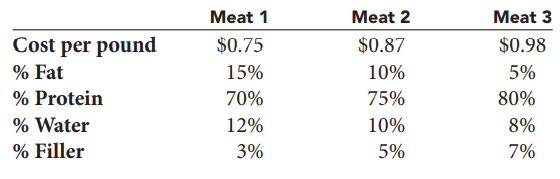 The owner of the Weiner-Meyer meat processing plant wants to determine the best blend of meats to use in the next production run of hamburgers. Three sources of meat can be used. The following table summarizes relevant characteristics of these meats: