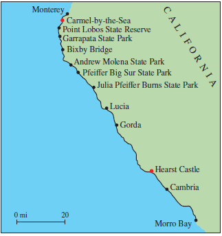 the scale on the map, estimate the distance between Carmel- by-the-Sea and Hearst Castle.