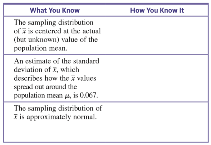 The paper âalcohol consumption, Sleep, and academic performance among college Studentsâ ( Journal of Studies on Alcohol and Drugs [2009]: 355â363) describes a study of n = 236 students who were randomly selected from a list of students enrolled at a liberal arts college in the northeastern region of the United States. Each student in the sample responded to a number of questions about their sleep patterns. For these 236 students, the sample mean time spent sleeping per night was reported to be 7.71 hours and the sample standard deviation of the sleeping times was 1.03 hours. Suppose that you are interested in learning about the value of m, the population mean time spent sleeping per night for students at this college. The following table is similar to the table that appears in Example 12.4. The âwhat you knowâ information has been provided. Complete the table by filling in the âhow you know itâ column.