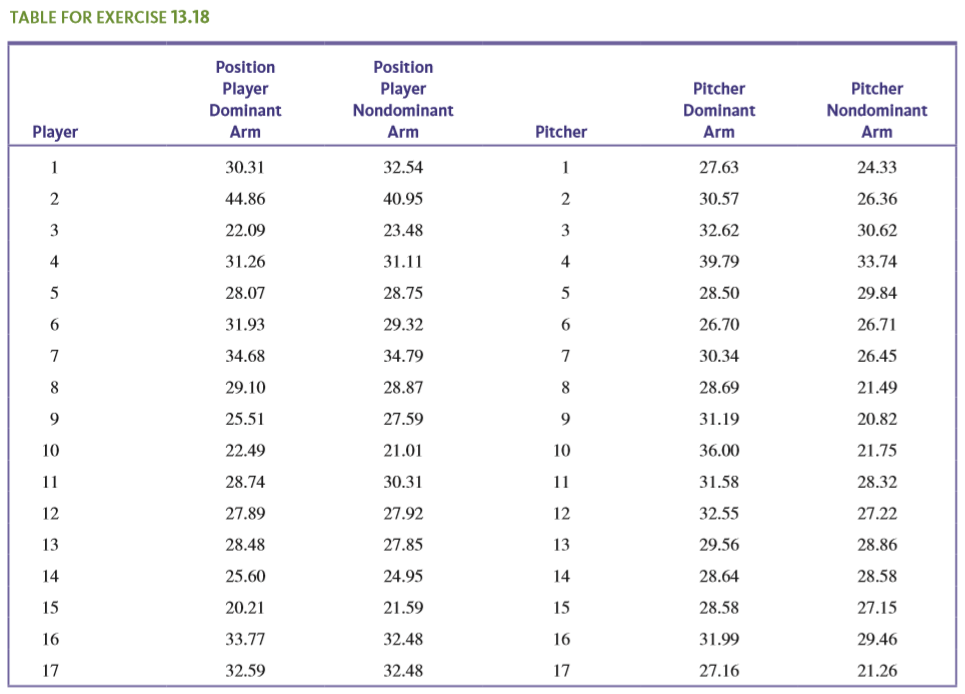 TABLE FOR EXERCISE 13.18 Position Position Player Player Pitcher Pitcher Dominant Nondominant Dominant Nondominant Player Arm Arm Pitcher Arm Arm 1 30.31 32.54 1 27.63 24.33 44.86 40.95 2 30.57 26.36 3 22.09 23.48 3 32.62 30.62 4 31.26 31.11 4 39.79 33.74 5 28.07 28.75 5 28.50 29.84 6 31.93 29.32 6. 26.70 26.71 7 34.68 34.79 7 30.34 26.45 8. 29.10 28.87 8. 28.69 21.49 9. 25.51 27.59 9 31.19 20.82 10 22.49 21.01 10 36.00 21.75 11 28.74 30.31 11 31.58 28.32 12 27.89 27.92 12 32.55 27.22 13 28.48 27.85 13 29.56 28.86 14 25.60 24.95 14 28.64 28.58 15 20.21 21.59 15 28.58 27.15 16 33.77 32.48 16 31.99 29.46 17 32.59 32.48 17 27.16 21.26