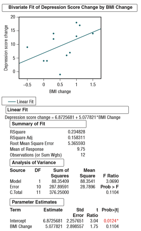 ![The paper referenced in Exercise 15.11 (“depression, body mass index, and chronic obstructive pulmonary disease—A holistic Approach,” International Journal of COPD [2016]:239–249) gave data on x 5 change in Body Mass Index (BMI in kilograms/meter2) and y 5 change in a measure of depression for patients suffering from depression who participated in a pulmonary rehabilitation program. JMP output for these data is shown below.