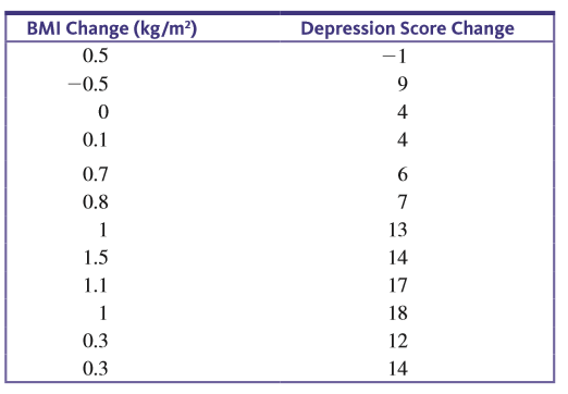 for patients suffering from depression who participated in a pulmonary rehabilitation program. The table below contains a subset of the data given in the paper and are approximate values read from a scatterplot in the paper.