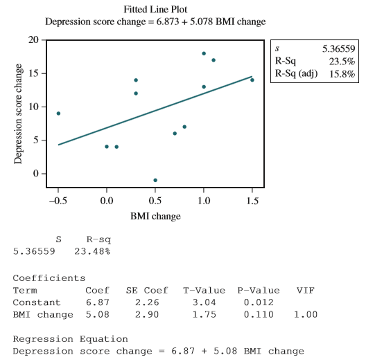 The paper referenced in Exercise 15.11 (âdepression, body mass index, and chronic obstructive pulmonary diseaseâA holistic Approach,â International Journal of COPD [2016]:239â249) gave data on x 5 change in Body Mass Index (BMI in kilograms/meter2) and y 5 change in a measure of depression for patients suffering from depression who participated in a pulmonary rehabilitation program. JMP output for these data is shown below.