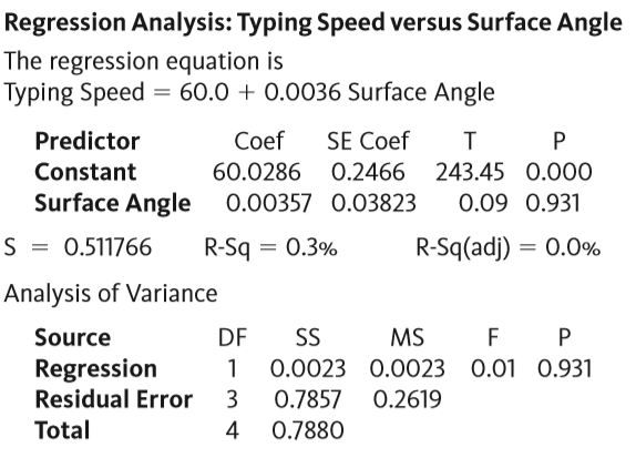 Regression Analysis: Typing Speed versus Surface Angle The regression equation is Typing Speed = 60.0 + 0.0036 Surface Angle Predictor Сoef SE Coef P Constant 60.0286 0.2466 243.45 0.000 Surface Angle 0.00357 0.03823 0.09 0.931 S 0.511766 R-Sq = 0.3% R-Sq(adj) = 0.0% Analysis of Variance Source DF S MS F P Regression Residual Error 1 0.0023 0.0023 0.01 0.931 3 0.7857 0.2619 Total 4 0.7880