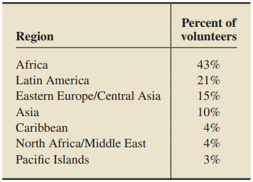 The Peace Corps is an independent U.S. government agency that provides trained volunteers for countries requesting assistance. According to Peacecorps.org, as of September 2012, volunteers currently serve in about 76 different host countries. The average age of a volunteer is about 28 years old. The following table reports the percentage of total volunteers serving by geographic region.