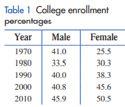 The percentages of female high school graduates who enrolled in college are given in the third column of Table 1.