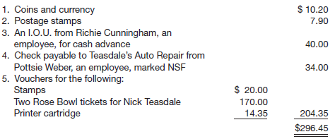 $ 10.20 1. Coins and currency 2. Postage stamps 3. An 1.O.U. from Richie Cunningham, an employee, for cash advance 4. Check payable to Teasdale's Auto Repair from Pottsie Weber, an employee, marked NSF 5. Vouchers for the following: Stamps 7.90 40.00 34.00 $ 20.00 Two Rose Bowl tickets for Nick Teasdale 170.00 Printer cartridge 14.35 204.35 $296.45