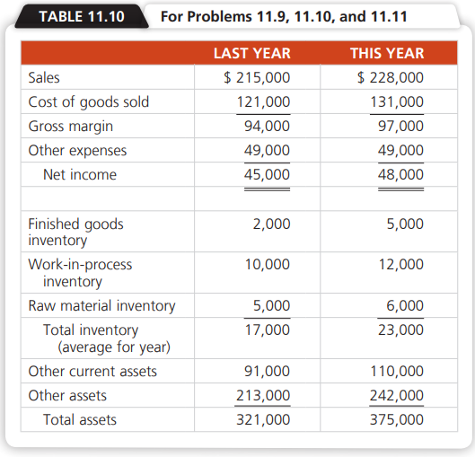 > Based on the data in Table 11.10, you have been asked to determine: a) The company’s percentage of assets committed to inventory last year. b) The company’s percentage of assets committed to inventory this year. c) The