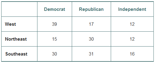 The poll described in Exercise 39 also investigated the respondents party affiliations based on what area of the state they lived in. Test an appropriate hypothesis about this table and state your conclusions. (Data in Montana revisited)