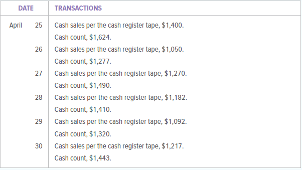 The Polynesian Gift Shop, a retail business, started business on April 25, 20X1. It keeps a $225 change fund in its cash register. The cash receipts for the period from April 25 to April 30, 20X1, are below.