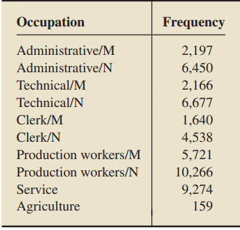 The population of Seoul was studied in an article by B. Lee and J. McDonald, “Determinants of Commuting Time and Distance for Seoul Residents: The Impact of Family Status on the Commuting of Women” (Urban Studies, Vol. 40, No. 7, pp. 1283–1302). The authors examined the different occupations for males and females in Seoul. The table at the top of the next page is a frequency distribution of occupation type for males taking part in a survey. (Note: M = manufacturing, N = nonmanufacturing.) If one of these males is selected at random, find the probability that his occupation is