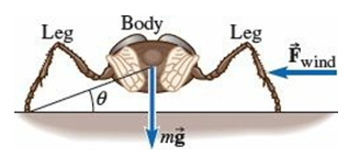 The posture of small animals may prevent them from being blown over by the wind. For example, with wind blowing from the side, a small insect stands with bent legs; the more bent the legs, the lower the body and the smaller the angle θ. The wind exerts a force on the insect, which causes a torque about the point where the downwind feet touch. The torque due to the weight of the insect must be equal and opposite to keep the insect from being blown over. For example, the drag force on a blowfly due to a sideways wind is Fwind = cAv2, where v is the velocity of the wind, A is the cross-sectional area on which the wind is blowing, and c â 1.3 N·s2·mâ4.