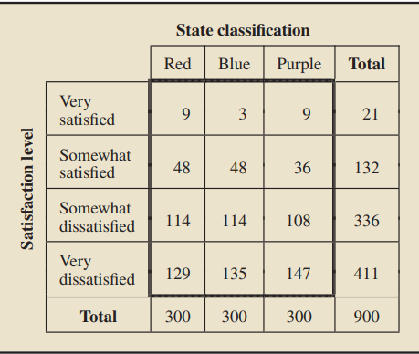 The Quinnipiac University Poll conducts nationwide surveys as a public service and for research. This problem is based on the results of one such poll. Independent simple random samples of 300 residents each in red (predominantly Republican), blue (predominantly Democratic), and purple (mixed) states were asked how satisfied they were with the way things are going today. The following table summarizes the responses.