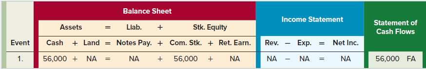 a. Use a horizontal financial statements model to show how each event affects the balance sheet, income statement, and statement of cash flows. More specifically, record the amounts of the events into the model. Also, in the Statement of Cash Flows column, classify the cash flows as operating activities (OA), investing activities (IA), or financing activities (FA). The first transaction is shown as an example.