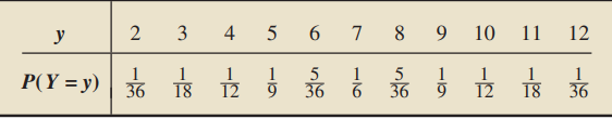 The random variable Y is the sum of the dice when two balanced dice are rolled. Its probability distribution is as follows.