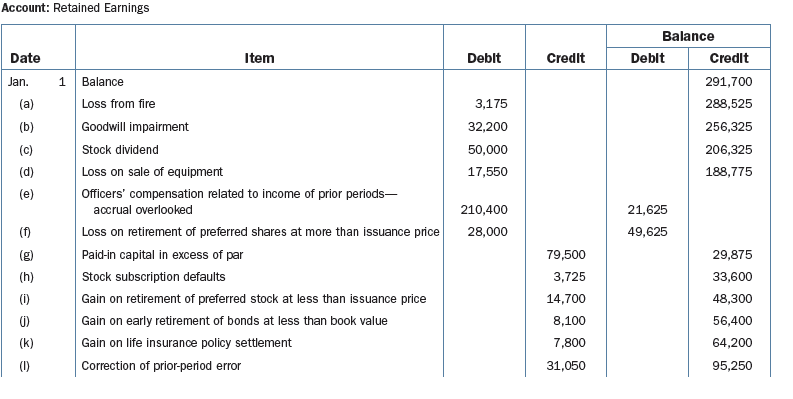 Account: Retained Earnings Balance Date Item Deblt Credit Deblt Credit Jan. 1. Balance 291,700 (a) Loss from fire 3,175 288,525 (b) Goodwill impairment 32,200 256,325 (c) Stock dividend 50,000 206,325 (d) Loss on sale of equipment 17,550 188,775 (e) Officers' compensation related to income of prior periods- accrual overlooked 210,400 21,625 (f) Loss on retirement of preferred shares at more than issuance price 28,000 49,625 (g) Paid-in capital in excess of par 79,500 29,875 (h) Stock subscription defaults 3,725 33,600 (1) Gain on retirement of preferred stock at less than issuance price 14,700 48,300 Gain on early retirement of bonds at less than book value 8,100 56,400 (k) Gain on life insurance policy settlement 7,800 64,200 (1) Correction of prior-period error 31,050 95,250