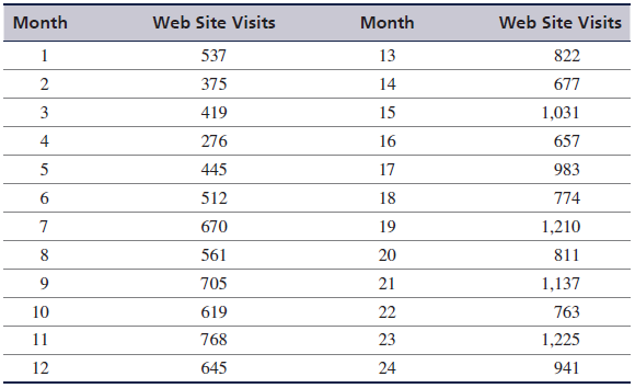 The River is a literary magazine published by the English Department at Tech. It has a 70-year history and enjoys an excellent reputation for providing a literary outlet for aspiring Appalachian writers in particular. However, its sales, mostly through independent bookstores and college libraries, have never been very large. Several years ago, the magazineâs advisory board decided to create a Web site and post the bimonthly issues online for free access. Due to poor economic conditions and state budget cuts, Tech recently withdrew funding for the magazine, and in order to make up for this financial loss, the magazineâs staff has decided to try to sell advertising (especially to local and regional businesses) on the magazineâs Web site. In order to sell advertising, the magazineâs staff would like to be able to provide potential advertisers with a forecast of the number of âvisitsâ the Web site might receive in future months. Following is the number of monthly visits the Web site has received for the 24 months that it has existed: