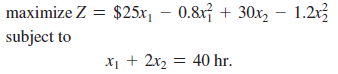 > The Evergreen Fertilizer Company produces two types of fertilizers, Fastgro and Super Two. The company has developed the following nonlinear programming model to determine the optimal number of bags of Fastgro (x1) and Super Two (x2) that it must produce