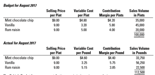 Budget for August 2017 TTTT TTTT Selling Price per Pint $9.00 Variable Cost Contribution Margin per Pints $4.20 Sales Volume per Pint $4.80 in Pints Mint chocolate chip 35,000 45,000 20,000 100,000 Vanilla 3.20 5.00 5.80 4.00 9.00 Rum raisin 9.00 Actual for August 2017 Selling Price per Pint $9.00 Sales Volume in Pounds 33,750 Variable Cost Contribution per Pound SA.60 Margin per Pound Mint chocolate chip $4.40 Vanilla 9.00 3.25 5.75 56,250 Rum raisin 3.85 22,500 112,500 9.00 5.15
