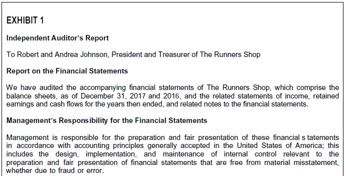 ![The Runners Shop (TRS) was a family-owned business founded 17 years ago by Robert and Andrea Johnson. In July of 2018, TRS found itself experiencing a severe cash shortage that forced it to file for bankruptcy protection. Prior to shutting down its operations, TRS was engaged in the retail sale of athletic footwear and related products for runners. TRS’s 2017 audited financial statements reported net sales of $2,217,292 and a net loss of $50,980. Consistent with prior years, sales were strongest in the second and fourth calendar-year quarters, with the first calendar-year quarter substantially weaker than the rest.