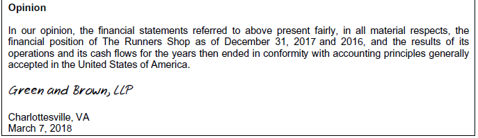 Green and Brown, LLP audited the financial statements of TRS for the previous 10 years. Because TRS is not publicly traded, Green and Brown performed their audits under professional standards for audits of nonpublic companies. The audit report issued for the 2017 and 2016 financial statements is shown in Exhibit 1.