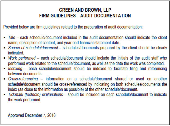 [2] Review Green and Brown, LLP’s audit documentation guidelines and explain why an audit firm would want to include each of the listed items in its audit documentation.