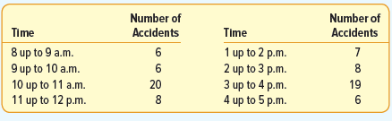 Using the goodness-of-fit test and the .01 level of significance, determine whether the accidents are evenly distributed throughout the day. Write a brief explanation of your conclusion.