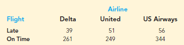 The sample data below represent the number of late and on time flights for Delta, United, and US Airways. Airline