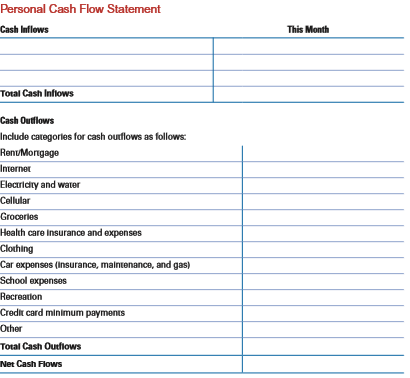 Personal Cash Flow Statement Cash Inflows This Month Total Cash Inflows Cash Outflows Include categorles for cash ourflows as follows: RenuMongage Interner Electridty and water Cellular Groceries Health care insurance and exponses Clothing Car expenses (insurance, maintonance, and gas) School expenses Recreation Credit card minimum payments Other Total Cash Outflows Net Cash Flows