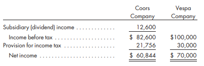 Coors Vespa Company Company $520,000 350,000 $370,000 180,000 Sales ... Less cost of goods sold. .. Gross profit .... Less operating expenses $170,000 100,000 $190,000 90,000 Operating income. $ 70,000 $100,000 Coors Vespa Company Company Subsidiary (dividend) income 12,600 $ 82,600 $100,000 30,000 Income before tax Provision for income tax 21,756 Net income $ 60,844 $ 70,000