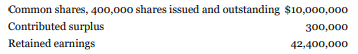 Common shares, 400,000 shares issued and outstanding $10,000,000 Contributed surplus 300,000 Retained earnings 42,400,000