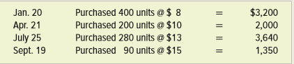 Purchased 400 units @ $ 8 Purchased 200 units @ $10 Purchased 280 units @ $13 Jan. 20 $3,200 Apr. 21 July 25 Sept. 19 2,000 3,640 Purchased 90 units @ $15 1,350 I| || ||||