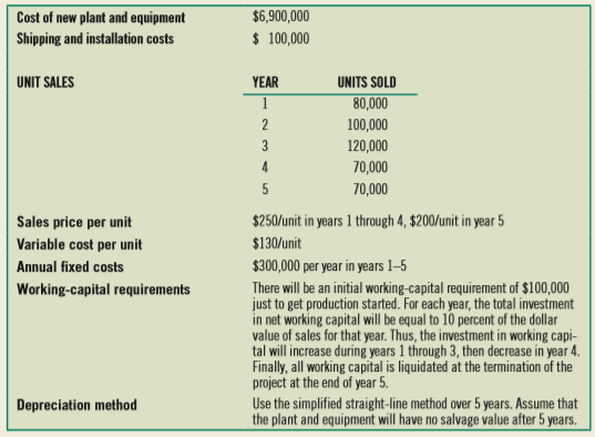 Cost of new plant and equipment Shipping and installation costs $6,900,000 $ 100,000 UNIT SALES YEAR UNITS SOLD 80,000 2 100,000 3 120,000 4 70,000 5 70,000 Sales price per unit $250/unit in years 1 through 4, $200/unit in year 5 Variable cost per unit $130/unit Annual fixed costs $300,000 per year in years 1–5 There will be an initial working-capital requirement of $100,000 just to get production started. For each year, the total investment in net working capital will be equal to 10 percent of the dollar value of sales for that year. Thus, the investment in working capi- tal will increase during years 1 through 3, then decrease in year 4. Finally, all working capital is liquidated at the termination of the project at the end of year 5. Working-capital requirements Use the simplified straight-line method over 5 years. Assume that the plant and equipment will have no salvage value after 5 years. Depreciation method