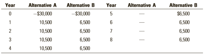 Year Alternative A Alternative B Year Alternative A Alternative B -$30,000 -$30,000 $6,500 1 10,500 6,500 6 6,500 2 10,500 6,500 7 6,500 3 10,500 6,500 8 6,500 4 10,500 6,500