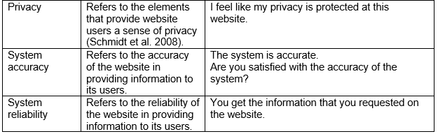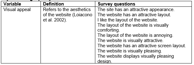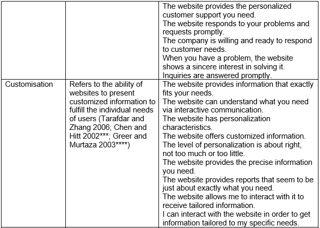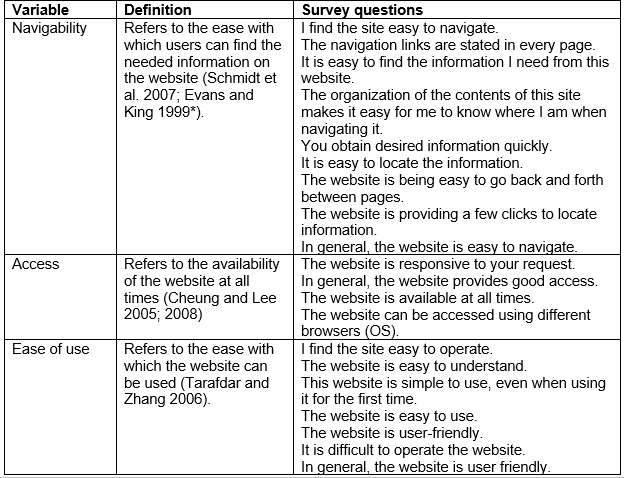 Note. The âsurvey questionsâ in the last column are questions from various studies on website quality. I have tried to find as many questions as I could. Every single survey question is taken out of (one of) the papers presented in the reference list.