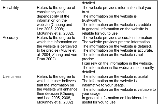 Information quality System quality Satisfaction with the Website Interactivity System design quality Survey questions The range of information is high. the information provided The information is applicable to the website's activities (zie relevance). (Hernandez et al. 2009) The information is detailed (zie accuracy). Variable Definition Refers to the content of Information content by the website The main goal of the information on the website is clear. The website provides in-depth information. The information on the website is informative to your usage. The information on the website is valuable to your usage. The information on the website is of the Refers to the degree to which the information meets the needs of the website user (Muylle et al. 2004). appropriate detail. The content on the website supports its intended purpose. The website provides information that exactly fits your needs. The information is applicable to the website's activities. Relevance The information in the website is relevant. The information in the website is to the point. The information in the website does not help me at all. Refers to the currency of Information is always updated in the site. the information on the Up-to-date The website provides up-to-date information. website (McKinney et al. The information is current. 2002). You get the information you need in time. The content of the website is easy to understand. Understandability Refers to the clearness and goodness of the information (Cheung and The meaning of the information is clear. Lee 2005, 2008). The information in the website is clear to me. The information in the website is presented clearly. The information is clear in meaning. The information is easy to comprehend. In general, information on the website is understandable for you to use. The website provides comprehensive information. Refers to the completeness of the information on the Completeness website (Muylle et al. | 2004) The website provides sufficient information. The information in the website is complete. The information in the website is sufficiently detailed. The website provides information that you Refers to the degree of consistency and dependability of the information on the website (Cheung and Lee 2005, 2008; McKinney et al. 2002). Refers to the degree to which the information on The website provides precise information. the website is perceived The information on the website is detailed. | to be precise (Muylle et al. 2004; Zhang and von The information on the website is not Dran 2002). Reliability trust. The information on the website is trustworthy. The information on the website is credible. In general, information on the website is reliable for you to use. The website provides accurate information. Accuracy The information on the website is accurate. precise. I can rely on the information in the website. The information in the website is sufficiently detailed. Refers to the degree to which the user believes Usefulness The information on the website is useful. The information on the website is informative to your usage. that the information on the website will enhance The information on the website is valuable to their decision (Cheung and Lee 2005, 2008; McKinney et al. 2002) your usage. In general, information on blackboard is useful for you to use. Variable Navigability Definition Refers to the ease with Survey questions I find the site easy to navigate. which users can find the The navigation links are stated in every page. It is easy to find the information I need from this website. The organization of the contents of this site makes it easy for me to know where l am when navigating it. You obtain desired information quickly. It is easy to locate the information. The website is being easy to go back and forth between pages. The website is providing a few clicks to locate information. needed information on the website (Schmidt et al. 2007; Evans and King 1999*). In general, the website is easy to navigate. Refers to the availability The website is responsive to your request. In general, the website provides good access. The website is available at all times. Access of the website at all times (Cheung and Lee 2005; 2008) Refers to the ease with which the website can be used (Tarafdar and Zhang 2006). The website can be accessed using different browsers (OS). I find the site easy to operate. The website is easy to understand. This website is simple to use, even when using it for the first time. Ease of use The website is easy to use. The website is user-friendly. It is difficult to operate the website. In general, the website is user friendly. The website is well organized. I find the website easy to use. I find the site download time acceptable. Refers to the degree to which the website users The speed of display between pages is high. perceive the website to be fast or slow (Muylle et al. 2004). Speed There is very little time between my request for pages and having the pages displayed on my computer. The rate at which information is displayed is fast. The site doesn't waste my time. The website is time consuming. It does not take much time to get from one place in the website to another. The website is fast. The website is quickly loading all the text and graphics. When I use the website there is very little waiting time between my actions and the website's response. The website loads quickly. The website takes long too load. You feel the website is secure. The website has provisions for user authentication. Security Refers to the users perceptions' of the website's reliability and safety (Awamleh and Fernandes 2005). The website has an information policy. The website has adequate security features. I feel like my privacy is protected at this website. Privacy Refers to the elements that provide website users a sense of privacy (Schmidt et al. 2008). Refers to the accuracy The system is accurate. Are you satisfied with the accuracy of the system? System accuracy o