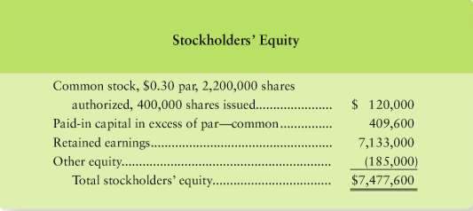 Stockholders' Equity Common stock, $0.30 par, 2,200,000 shares authorized, 400,000 shares issued. . Paid-in capital in excess of par-common. $ 120,000 409,600 Retained earnings. 7,133,000 Other equity.. Total Stockholders' Equity... (185,000) $7,477,600