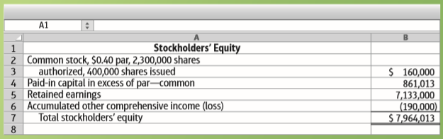 A1 1 Stockholders' Equity 2 Common stock, $0.40 par, 2,300,000 shares authorized, 400,000 shares issued $ 160,000 861,013 7,133,000 (190,000) $7,964,013 3 4 Paid-in capital in excess of par–common 5 Retained earnings 6 Accumulated other comprehensive income (loss) Total Stockholders' Equity 7 8.