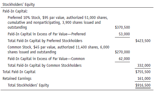 Stockholders' Equity Paid-In Capital: Preferred 10% Stock, $95 par value, authorized 51,000 shares, cumulative and nonparticipating, 3,900 shares issued and outstanding $370,500 Paid-In Capital in Excess of Par Value-Preferred 53,000 Total Paid-In Capital by Preferred Stockholders $423,500 Common Stock, $45 par value, authorized 11,400 shares, 6,000 shares issued and outstanding $270,000 Paid-In Capital in Excess of Par Value-Common 62,000 Total Paid-In Capital by Common Stockholders 332,000 Total Paid-In Capital $755,500 Retained Earnings 161,000 Total Stockholders' Equity $916,500